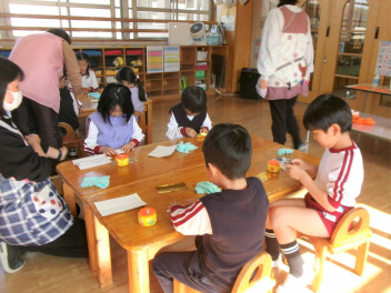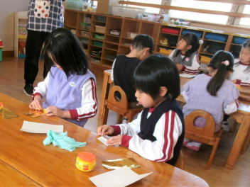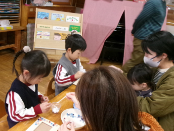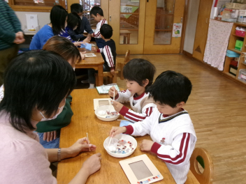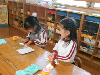 年長き組の子供たちも、ひな人形作り。卵型の胴体に小さくちぎった紙を張っていきます。根気のいる作業に、集中して取り組んでいました。完成が楽しみですlaugh