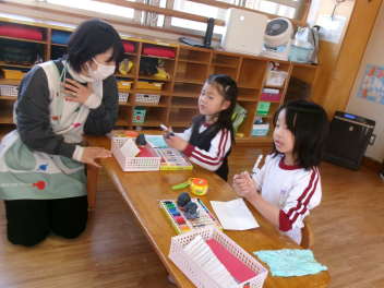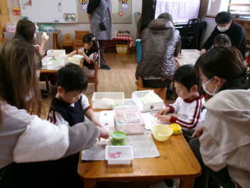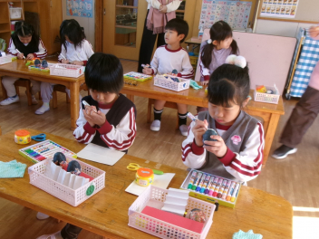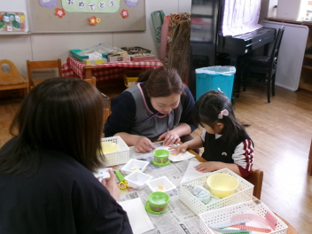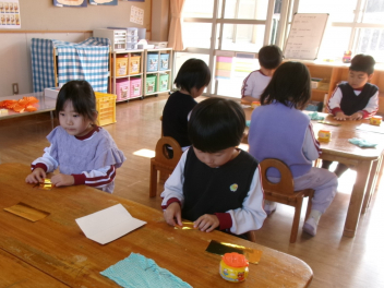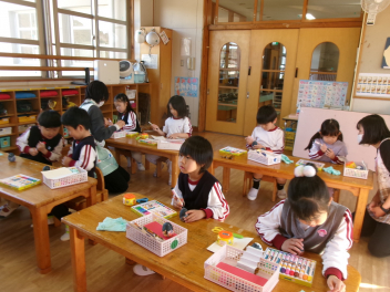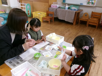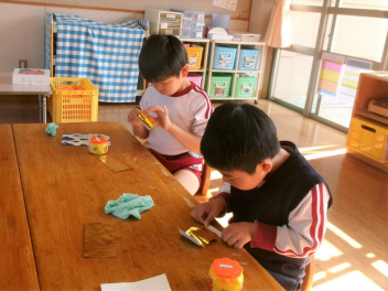 年中さんと年少さんは、ある目的があって何やら作っています。出来上がりが楽しみです。