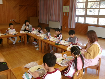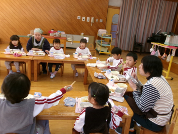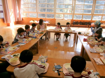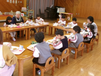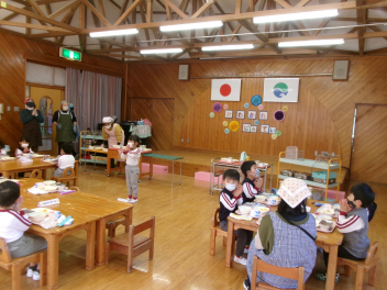 今日は、遊戯室での練習・準備の後、そのまま遊戯室で給食を一緒に食べました。いつもと違う場所、人数での食事。楽しい気分でいただきました。