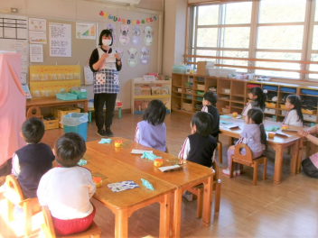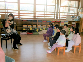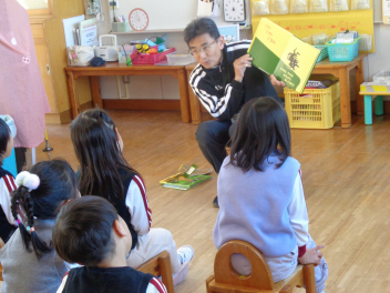 年少あか組の子供たち。外でも楽しく過ごしました。降園前は担任教師の読み聞かせ。愉快なお話に聞き入っていました