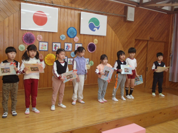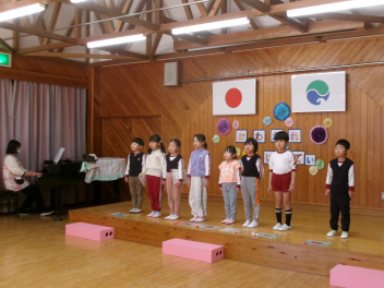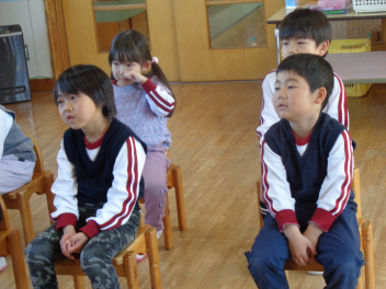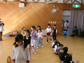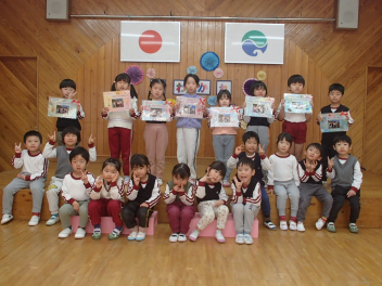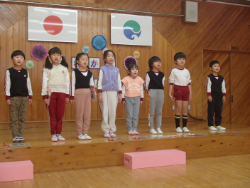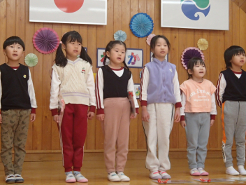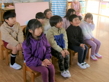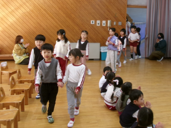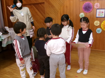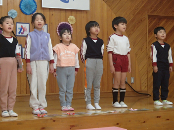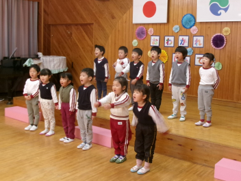 今日は年中もも組が計画してくれた『お別れ会』がありました。年長き組への感謝の気持ちをもって、楽しく過ごすことができるように考えました。プログラムは年少あか組の踊り、年中もも組の踊りの披露、あか組、もも組一緒に歌のプレゼントと、一緒に制作したプレゼントも渡しました。き組からのお礼として、心のこもった歌のプレゼントがありました。その後、一緒に遊び、給食も一緒に食べて楽しく過ごしました。
