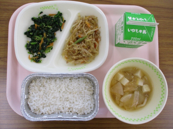 今日の給食メニューは、麦ごはん、牛乳、ひき肉ともやしのピリ辛炒め、ほうれん草と人参の胡麻和え、豚キムチ味噌汁でした。おいしくいただきました。