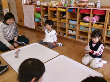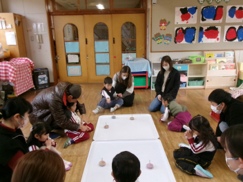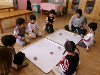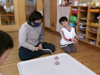 年中もも組。コマ回しを皆で楽しんでいました。長く回す勝負もしています。