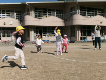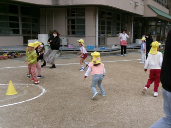 その後、園庭に出て「宝取り」。ここでも対決。子供チームと大人チームに分かれて戦いました。作戦を立て、すばしこく走り回る子供たち。勝負は同点、引き分けでした。皆で一緒に楽しい時間を過ごしましたsad