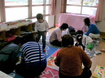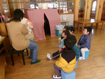 今日は、読み聞かせの日。保護者ボランティアの方、職員で読み聞かせをしました。降園前のひとときです。