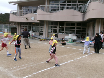 楽しくダンスをして体をほぐし温めた後は、かけ足。音楽が流れている間、走り続けます。年少さんも慣れてきて、歩くことなく走り切っています。