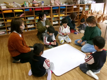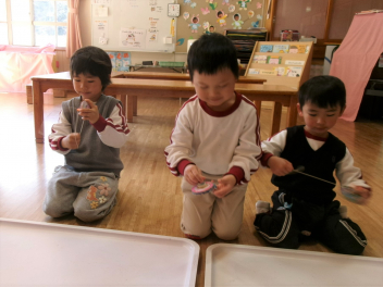 年中、年少の子供たちは、今日も、ある目的のために活動していました。問題を出し合ったり、歌を歌ったりして楽しんでいました。着々と準備を進めているようですfrown