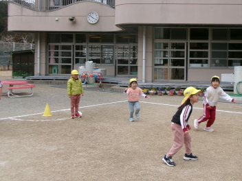 年中の子供たちは部屋でお話を聞いたあと、ペアになって実際の歩行を行いました。自分たちで横断歩道を渡ったり、歩道を歩いたりするとともに、ペアで手をつないで歩くことで、おうちの人と手をつないで歩くことの意識づけをしました。