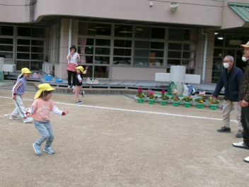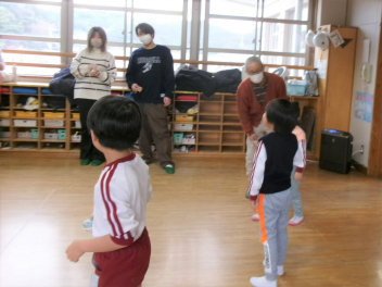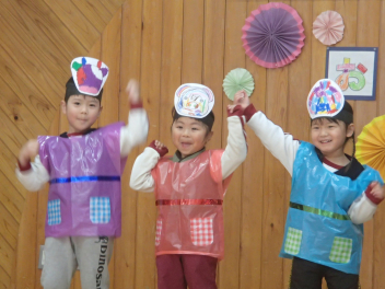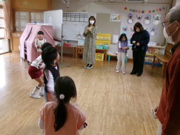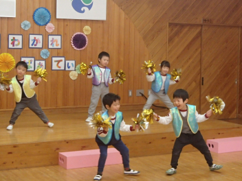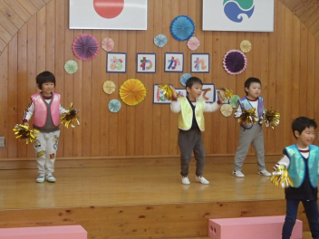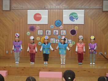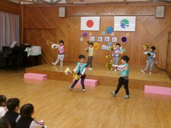 今日は1・2歳っ子自由来園日。年少あか組の子供たちが踊りを披露しました。とっても楽しそうに踊る年少さんたちですsad