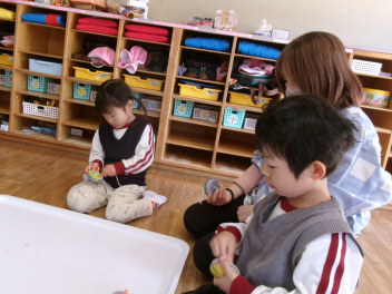 外へ出る前のひととき。年中もも組の子供たちは、粘土遊びに夢中でしたsmiley