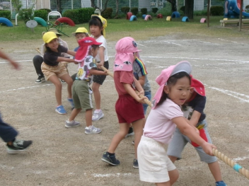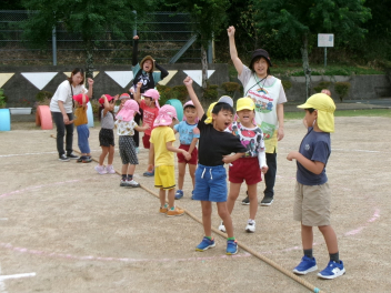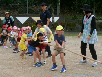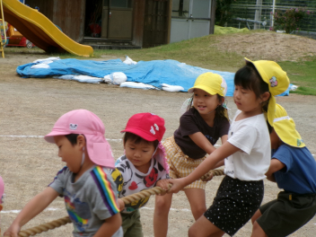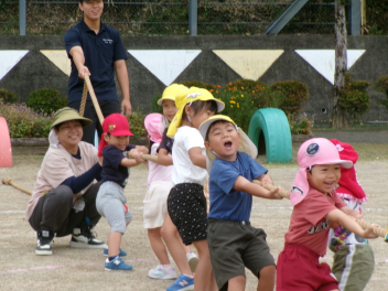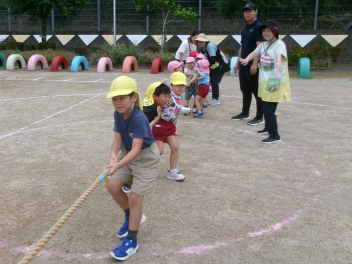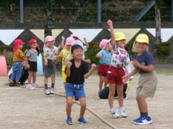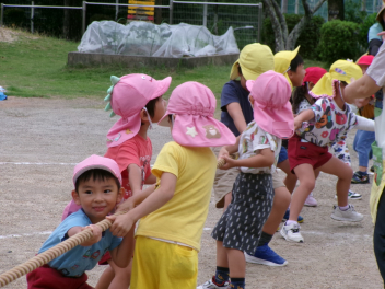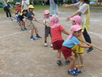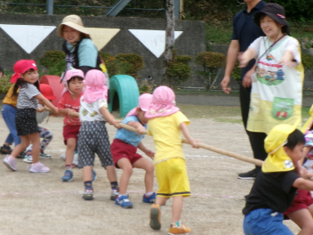 開始前の掛け声も勇ましく、スタートの合図で力いっぱい引っ張り踏ん張る子供たち。チームで力を合わせて勝負する楽しさを味わうことができたようですsad