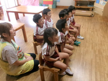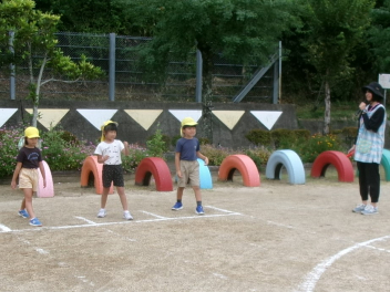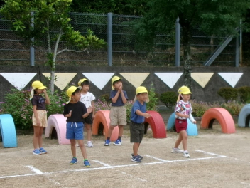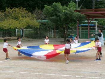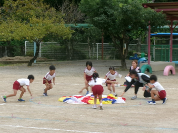 年長き組の子供たち。今日もかけっこやリレー、パラバルーンに熱心に取り組んでいましたfrown