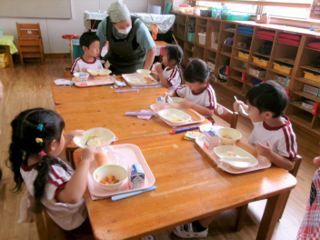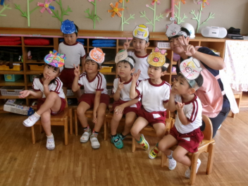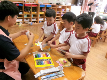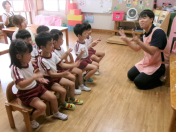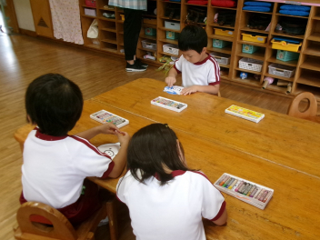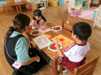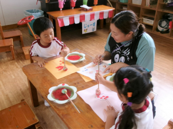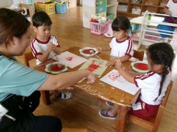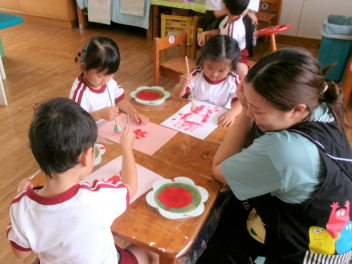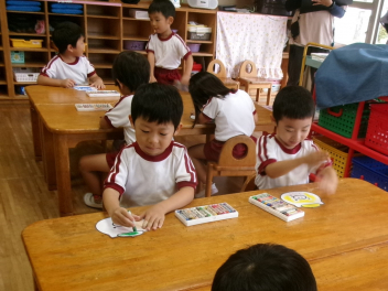 年少あか組の子供たち。スタンプ遊びで、玉入れを表現していました。本番の玉入れで、たくさん入りますように!