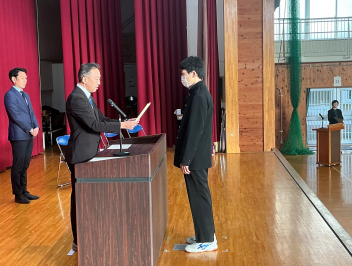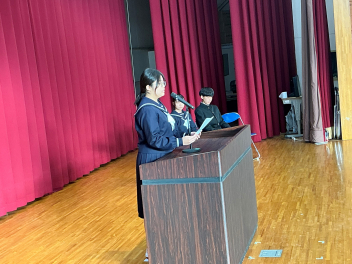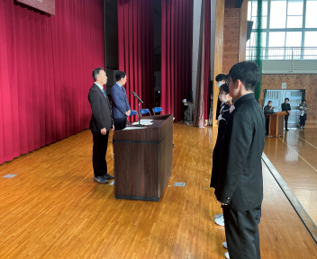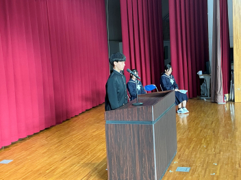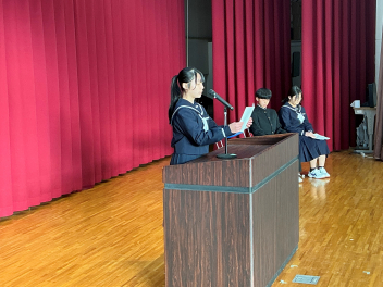 12月23日に2学期の終業式が行われました。生徒会の朝の挨拶の後、表彰が行われ、その後、各学年の代表生徒が2学期を振り返って話をしました。校長先生からは2学期の頑張りをたたえる話と冬休みの有意義な過ごし方についてお話がありました。