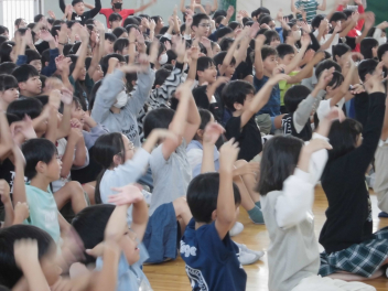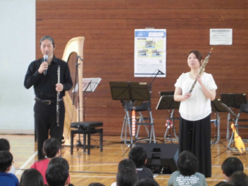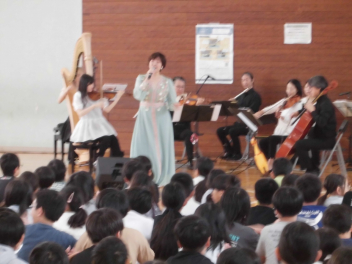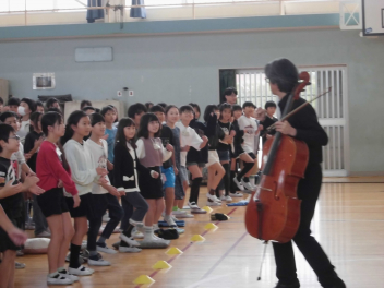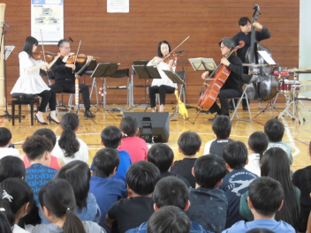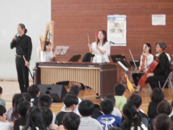 •  クラッシックコンサート2025 萩丘小90周年記念コンサートが行われました。東京アーティスツ合奏団の演奏を楽しみました。バイオリン、コントラバス、ハープなどの楽器のお話を聞くとともにそれぞれの音色を楽しみました。また、その演奏に合わせて歌ったり、体を動かしたりとクラッシック音楽を楽しむことができました。