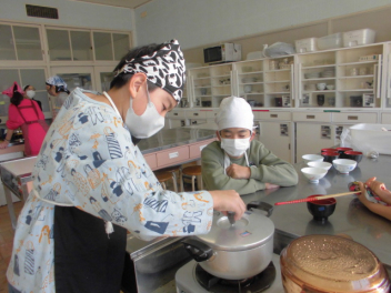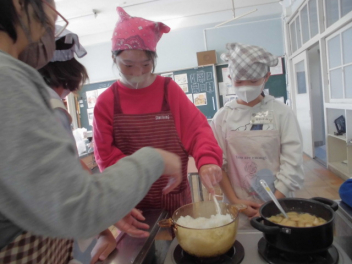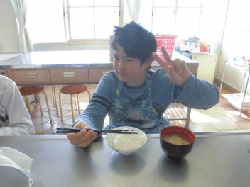 にこにこほほえみ学級の5・6年生で調理実習を行いました。ご飯を鍋で炊いたり、みそ汁を作ったりしました。みそ汁は煮干しで出汁を取ったので味に深みがあり、美味しくできました。自分で炊いたご飯とみそ汁は、お代わりをしたくなるくらい美味しかったようで笑顔がたくさん見られました。