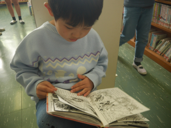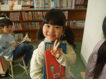 昼休みに図書室をのぞいてみると、たくさんの子が本を借りていました。