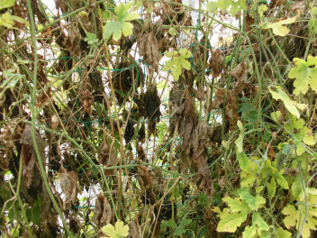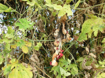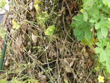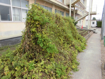 •  ツルレイシもだいぶ枯れてきました。でも、まだ緑の実をつけています。葉も青々したものがあります。いつまで元気に成長していくでしょうか。