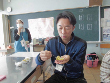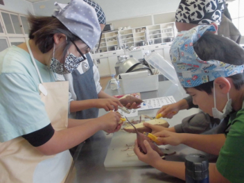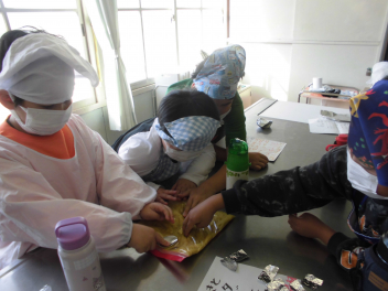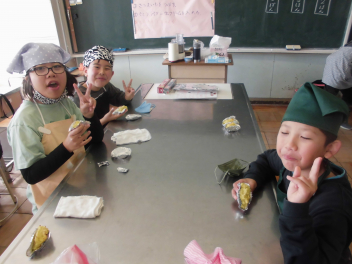 収穫したサツマイモを使ってスイートポテトづくりをしました。5、6年生が皮を剥いたり、ゆでたりして準備をしてくれました。そこへ1~4年生が合流してバター、砂糖、生クリームを入れ混ぜる活動をしました。どの子も笑顔で活動に参加することができました。焼き色がついたスイートポテトは最高だったようで、「おいしい。」と言いながら食べていました。スイートポテトを食べてくれた校長先生から「おいしい。」の言葉をもらい、みんな満足気な表情でした。たくさんのスタサポさんにもご協力いただいたおかげで笑顔あふれる活動になりました。ありがとうございました。