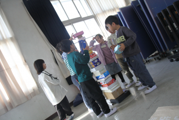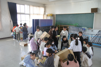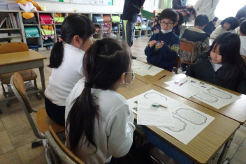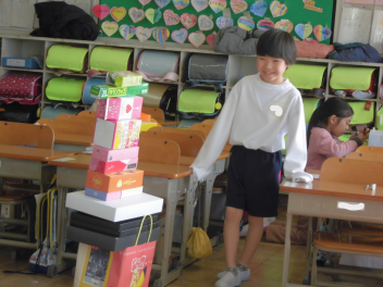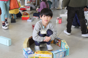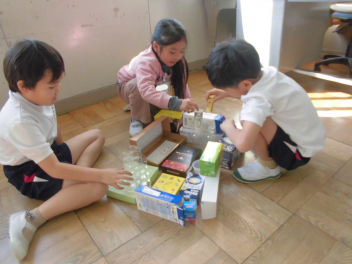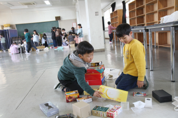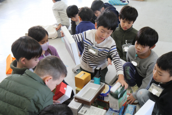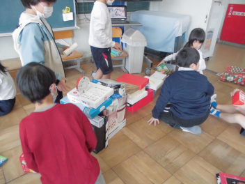 • 1年生図工で、箱や身の回りの物を使って作りたいものを表現しました。