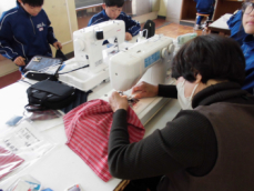 慣れない手つきでも、一生懸命ミシンを操作しています。