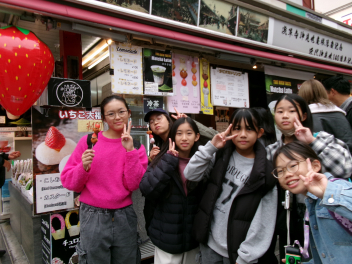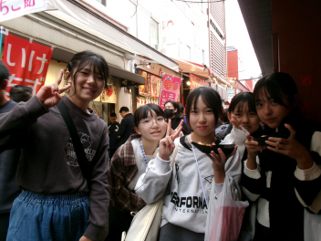 浅草コースは、雷門で記念写真を撮った後、仲見世通りを散策しました。大勢の観光客がいる中、自分たちが調べたお店や気になるお店に、友達と足を運んで思い出をつくることができました。