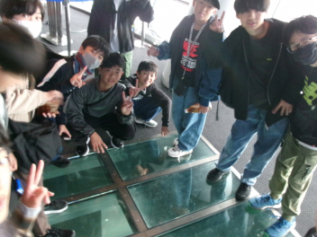 一つ目の目的地、スカイツリーでは早朝から見学をしました。首都東京の街並みをスカイツリーの上から眺めたり、ガラスの床から高さを感じたり、記念写真を撮ったりして過ごしました。