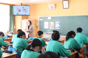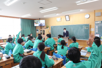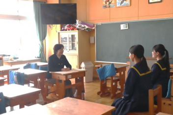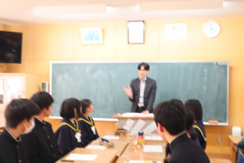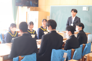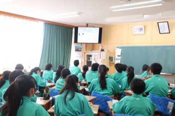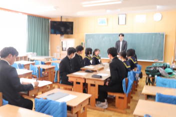 •  2月10日(火)4時間目、1年生では再来年の修学旅行に向けて、訪問地区について理解を深めるプレゼンテーションを聞きました。まだ2年先の修学旅行ですが、訪問地について、地理的な特徴、特産物や歴史的な観光地についてプレゼンを見て知識を増やしました。旅行業者の方の丁寧な説明に、生徒たちは訪問地について興味を持ったようでした。旅行業者の方に、さらに質問をして理解を深めました。