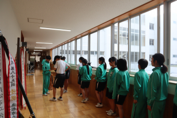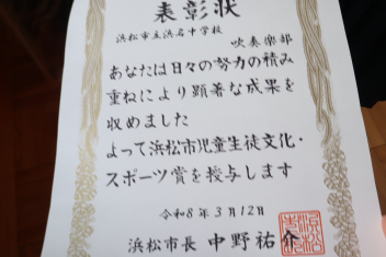 3月12日(木)午後、浜名中吹奏楽部が『浜松市児童生徒文化・スポーツ賞』(団体)を受賞しました。今日は、部を代表して吹奏楽部 部長が受賞式に臨みました。この賞は「文化的活動やスポーツにおいて優秀な成績を収めた団体」に授与されます。浜名中吹奏楽部が今年、西部地区大会で金賞、静岡県大会でも金賞、さらに東海大会でも金賞であったことが、今回の賞に結実しました!今回の賞を励みに、さらに演奏の技量や団結に磨きを掛けてほしいと思います。