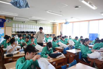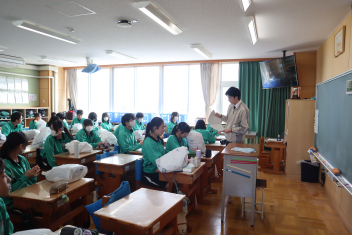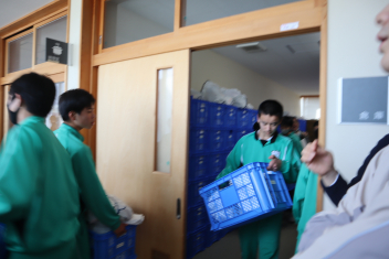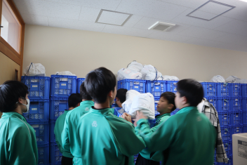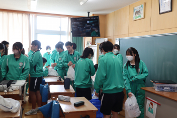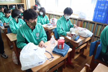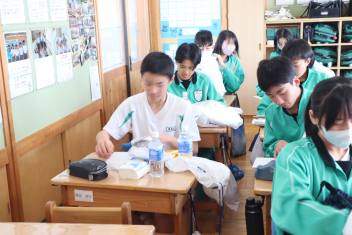 浜名中学校では、地震や風水害によって帰宅が困難になった場合を想定し、生徒1人ずつに防災袋を用意し、各自が選んだ防災用品を入れて3階倉庫に1年間保管しています。今日は年度末ということもあり、4月に格納していた備蓄品を生徒に戻し、何が必要なのか検討し、中身を入れ替えました。2年3組では、生徒たちが1年ぶりに中身を取り出し、中に入れるべきものを吟味しました。乾パンや水といった食料品だったり、ビニル袋や簡易トイレといった衛生用品だったり、生徒それぞれで工夫をしていました。