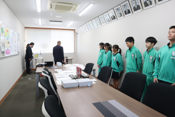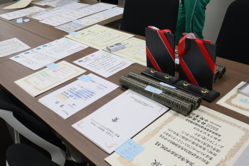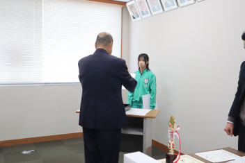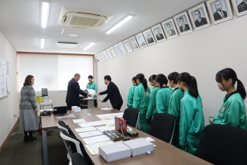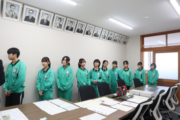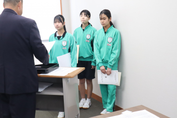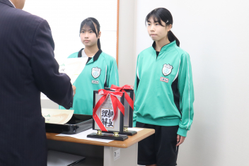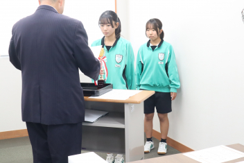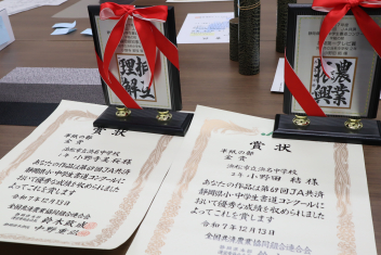 •  12月17日(木)、浜名中学校が「JA 書道コンクール」において学校賞を受賞しました(学校賞は県内1校のみ)。本校の1年生徒が県知事賞、2年生徒が金賞を受賞したほか、銀賞をはじめ多くの生徒の応募があったことによるためだそうです。今日は、JA浜名支店の方が校長先生に学校賞を渡しに来られました。12月13日(土)には県知事賞、金賞の授賞式が静岡市で開催され、その様子はテレビでも放映されました。書道に取り組む生徒たちには、今後も練習に励み、自己に磨きをかけていってください。