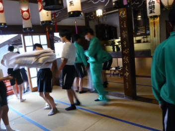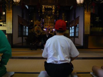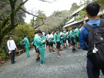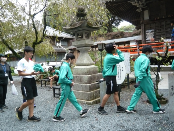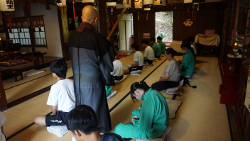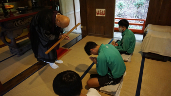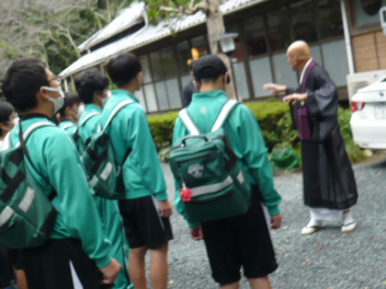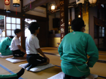•  10月21日(火)午前、10・11組は平口にある『不動寺』に行き、座禅体験と奉仕作業を行いました。浜名中から徒歩で15分の場所にある不動寺まで徒歩で行き、住職さんにごあいさつ。その後、本堂で気持ちを集中させて座禅をしました。学校とはちがう緊張感みなぎる時間を過ごしたようです。その後、奉仕作業として境内の落ち葉回収をしました。この落ち葉は学校に持ち帰り、後日行う焼いもをする時に使います。