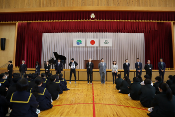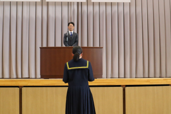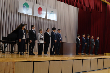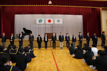 • 今年度は、新しく教育委員会から着任した校長先生をはじめ、計18名の教職員を迎えました。着任式・新任式では、代表生徒2名から心温まる「歓迎の言葉」が贈られ、新しく来られた先生方の表情も自然と和らいでいました。校訓「高めよマナー」と合言葉「自治の精神」始業式の式辞では、校長先生から本校の柱である2つの言葉をとりあげ、これらを日々の生活の指針とし、自分たちの手でより良い学校生活を創り上げてほしいとお話がありました。始業式での代表生徒による発表では、上級生としての自覚と「この1年間を悔いなく大切に過ごしたい」という力強い意気込みを感じることができました。その後の担任発表・部活動顧問発表では、会場に心地よい緊張感が漂いました。「どの先生が担任になるんだろう?」と目を輝かせ、ドキドキしながら発表を待つ生徒たちの姿に、新年度への期待感が溢れていました。