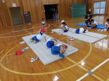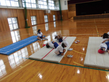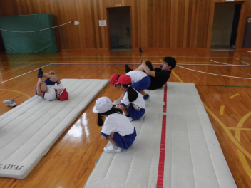 • 1年生は、体育科の学習でマット遊びを行いました。