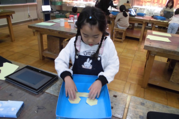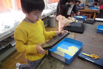 • 1年生は、算数科「かたちあそび」の学習で、箱の面を写し取った形を使って絵をつくる活動を行いました。