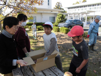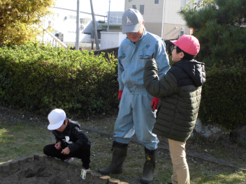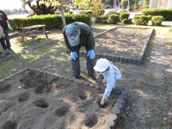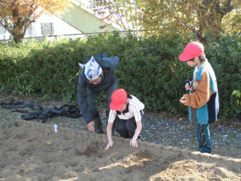 今日は、花壇の土に子供たちがチューリップの球根を植えました。