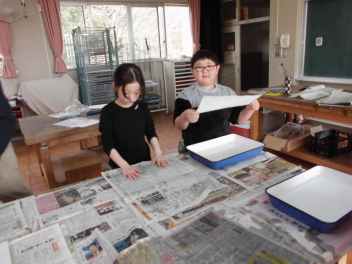前時までに作った版に、水分を含ませた刷り取り紙を重ね、バレンで円を描くように擦ります。。