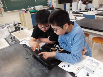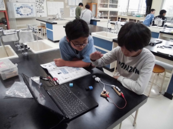 • 6年生は、理科「私たちの生活と電気」の学習で、プログラミングに挑戦しました。