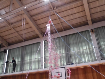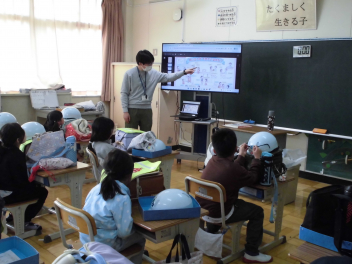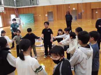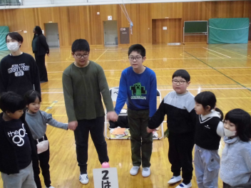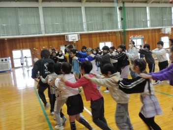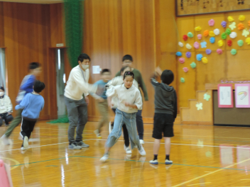 •  1年生が体育館で「ボールはこびおに」をしました。自分の腰についたタグをとられないように、相手をかわしながら先に進んでいきます。今日は、どうすれば相手をかわしやすくなるか、チームで作戦を立てました。寒さを感じさせないほど、熱気にあふれた様子が見られました。