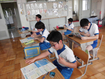 前時までにタブレットを使ってアンケート調査をしました。今日は、発表に向けて、アンケートの結果を整理したりスライドを作ったりしました。
