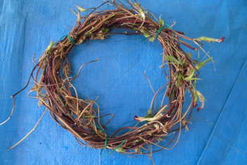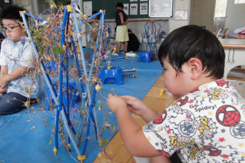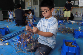 •  1年生が生活科の学習でリースをつくりました。材料は、1学期から大切に育ててきたアサガオです。鉢のアサガオを根っこから抜いた後、つるを丸く巻くようにしてつくりました。種もたくさんとることができ、子供たちは大喜びでした。