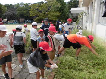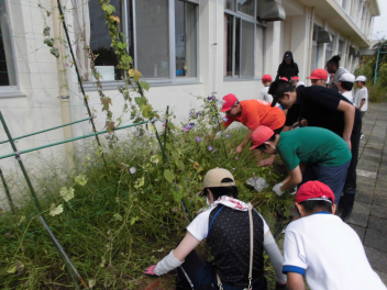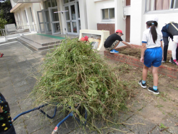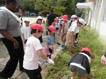 1班・2班の子供たちは、夏の間に生い茂った花壇の草取りを行いました。