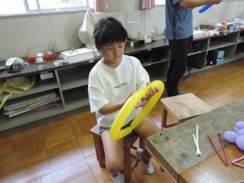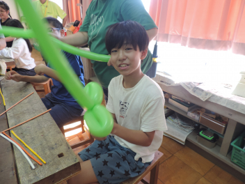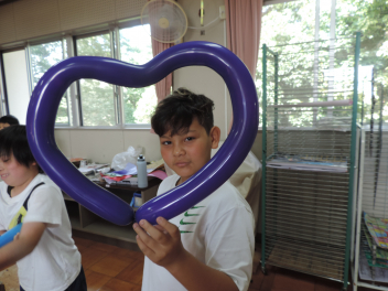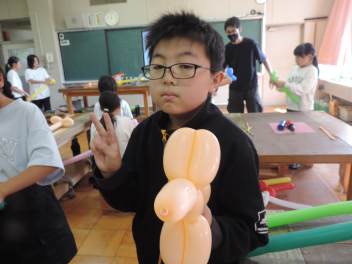 • 今日は、クラブ活動「バルーンアート」を4~6年生が行いました。講師の方とボランティアの方に手伝ってもらいながら、作品づくりをしました。最初は、空気を入れるのにもおっかなびっくりでしたが、だんだんと慣れてきて、最後には、自分でねじったり、つぶしたりもできるようになりました。