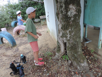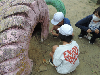 • 3年生が、図工「ここがすみか」の学習で、運動場にいろいろなもののすみかを作りました。虫や小人など、どんなもののすみかにするかを考え、すみかになりそうな場所を探しました。木の枝や小石、葉っぱなどを集めて「ベッドにしたよ」「線路を作ったよ」など、自由な発想で楽しく活動できました。