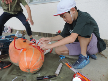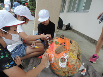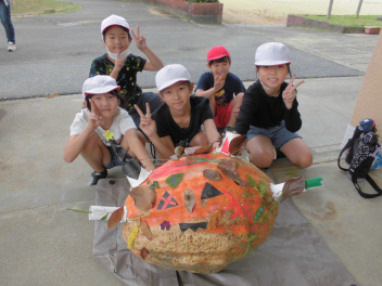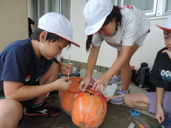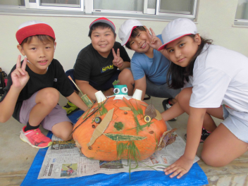 • 3年生が先日収穫したジャンボカボチャに飾り付けをしました。事前に設計図を作り、材料を用意しました。なかなか思い通りにはならなかったところもあったようですが、かわいいカボチャができあがりました。職員玄関横に飾ってあります。来校した際に御覧ください。