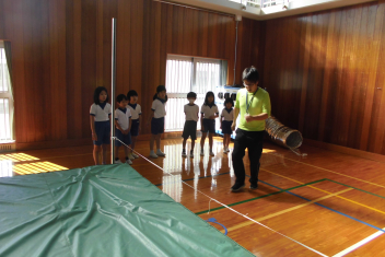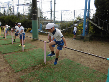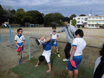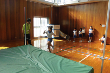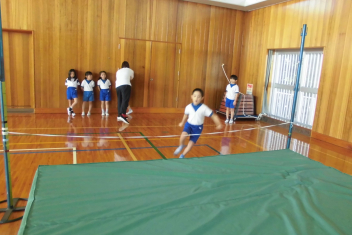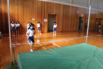 •  2年生が体育館で高とびにチャレンジしていました。子供たちが抵抗がないように棒ではなく、ゴムひもを使って練習の場が設定されていました。何度も何度も繰り返して跳ぶ様子が見られました。今日が第1回目ですので、これからより高く跳べるように練習に励んでいきます。