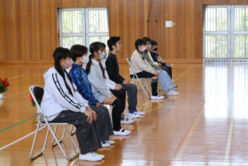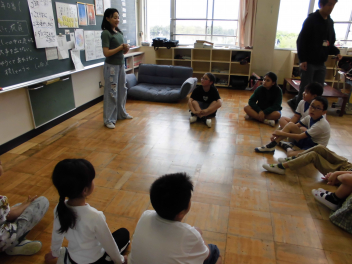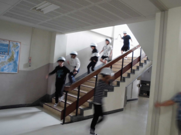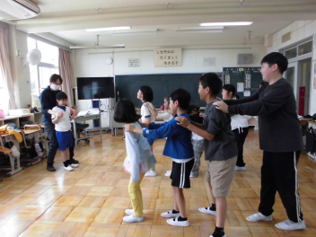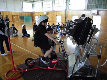 3~6年生は、体育館で自転車の乗り方について学びました。自転車シュミレーターを使って、実際に道路で自転車に乗っているときにどんなことに気をつければよいかを考えました。