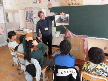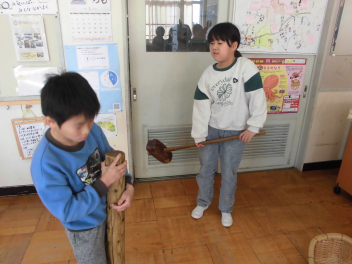 •  4年生は、社会の時間に、かつて「あばれ天竜」と言われた天竜川の治水工事をしたり、植林をしたりした「金原明善」の学習をしています。浜松市博物館からお借りした背負子(しょいこ)や明善鎌などの昔の道具に触れる機会を設けました。体験活動を通じて明善が活躍していた当時に想いを馳せました。