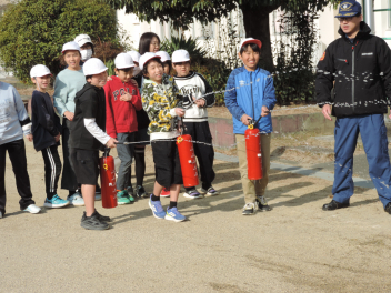 その後、4年生以上は水消火器を使用して、初期消火体験を行いました。