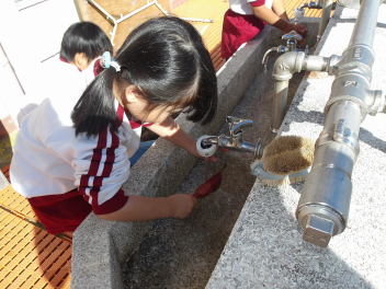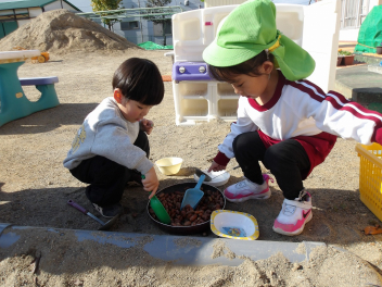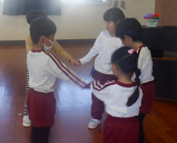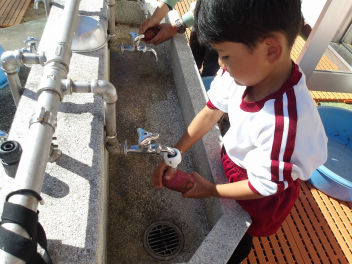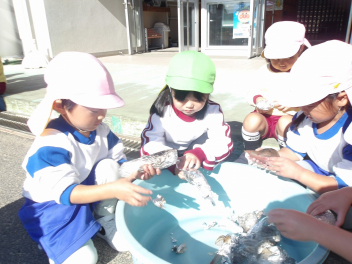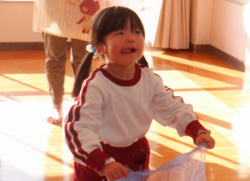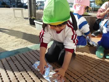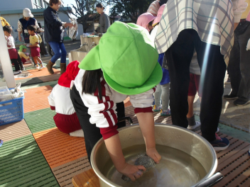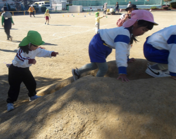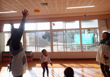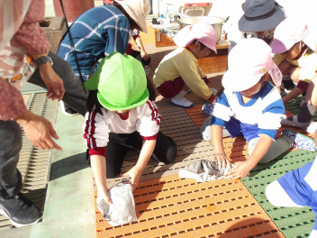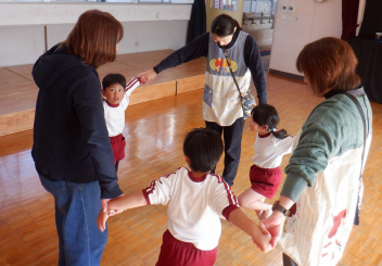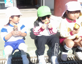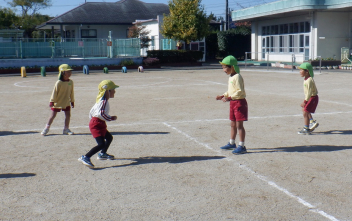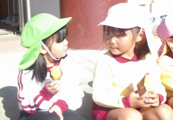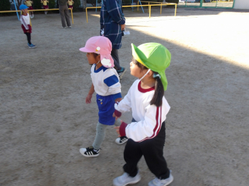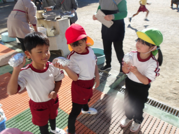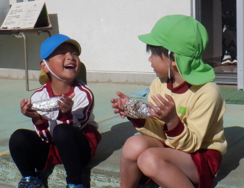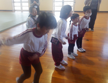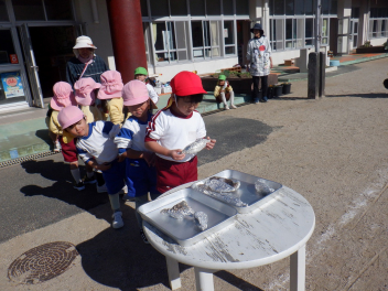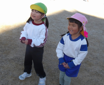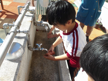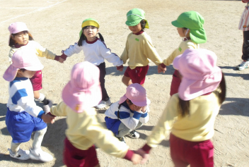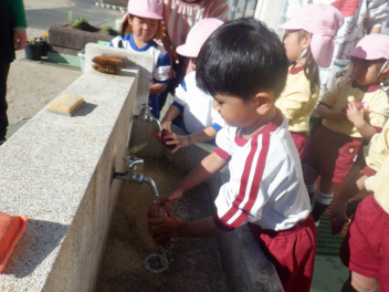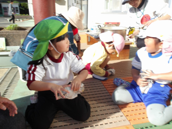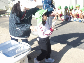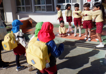 口にハンカチを当てて、落ち着いて園庭に避難することができた子供たち。